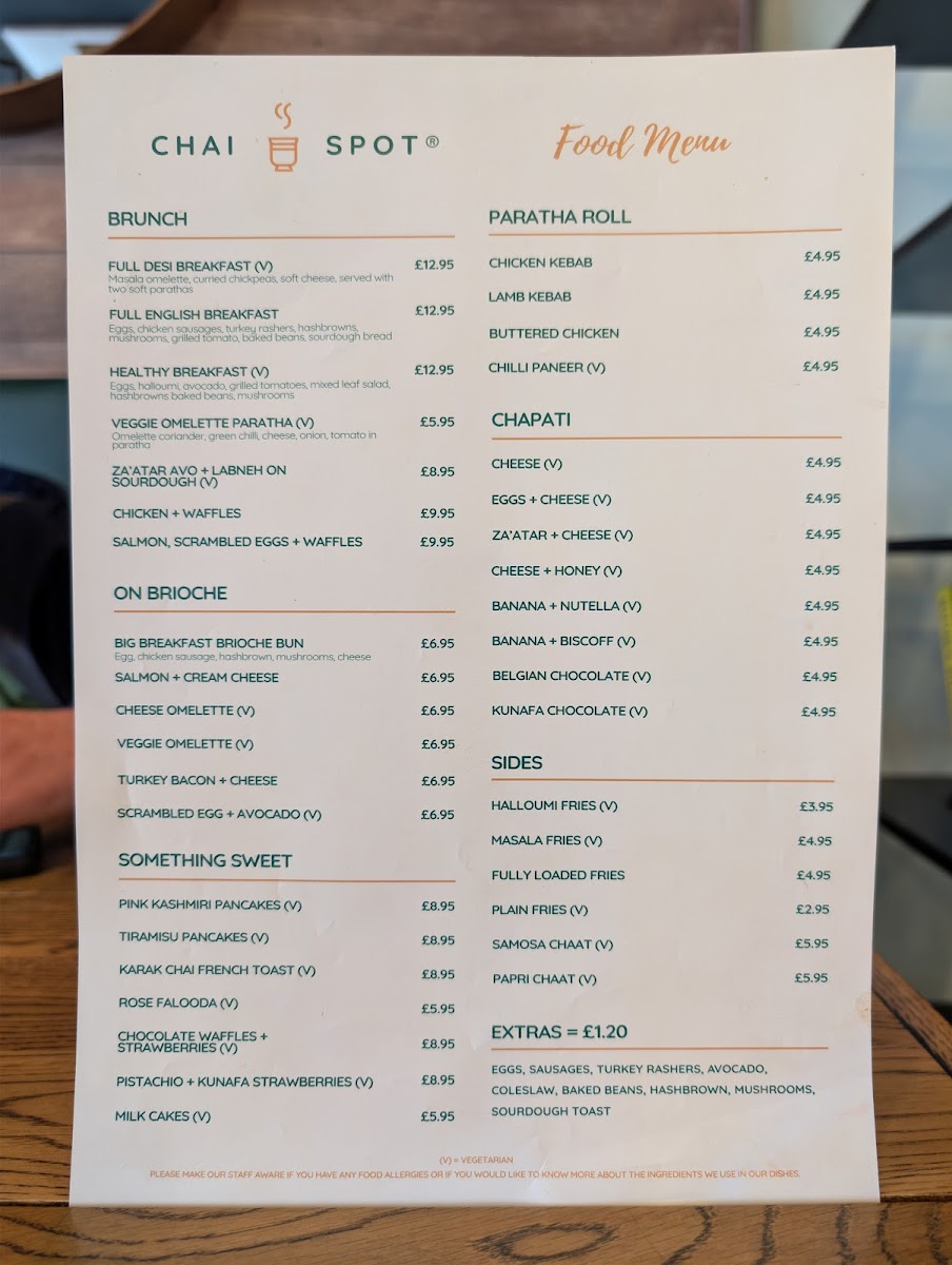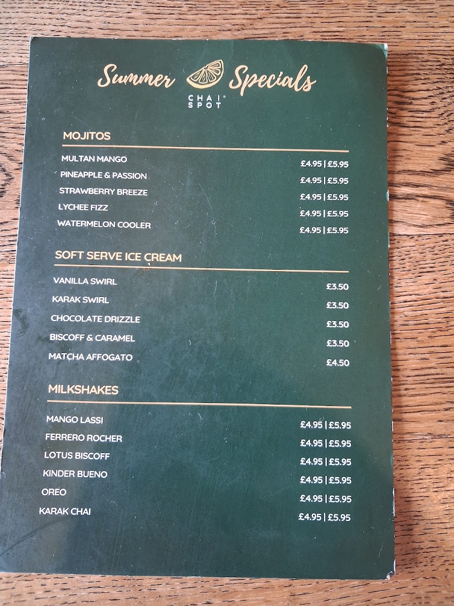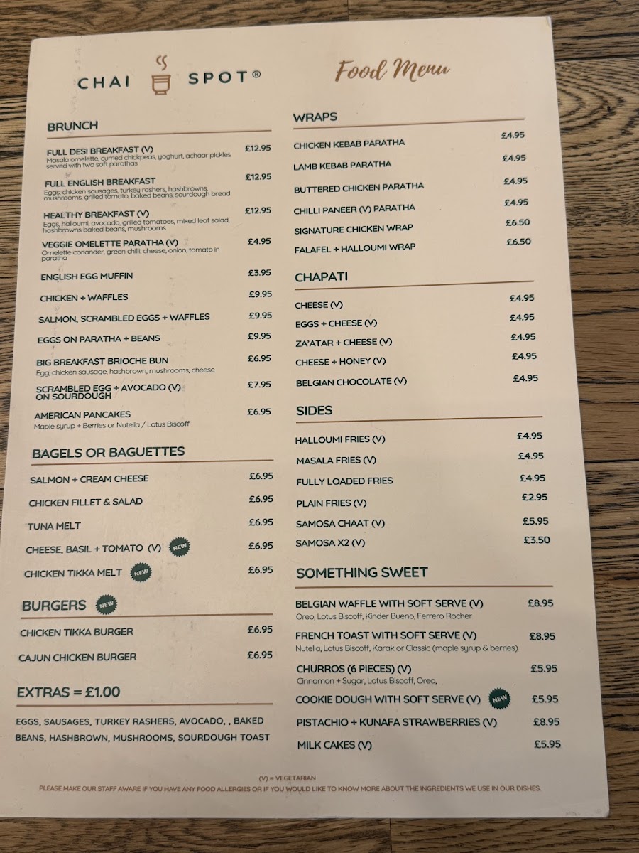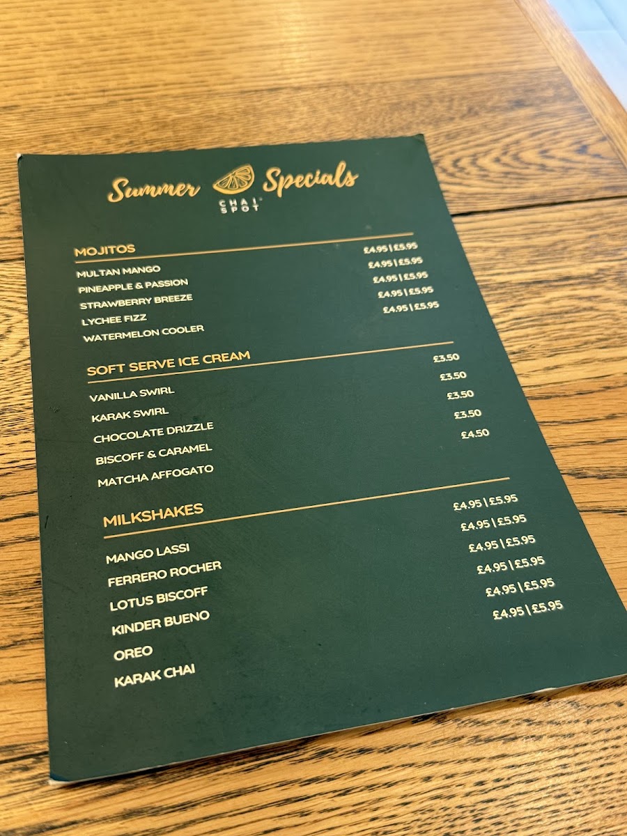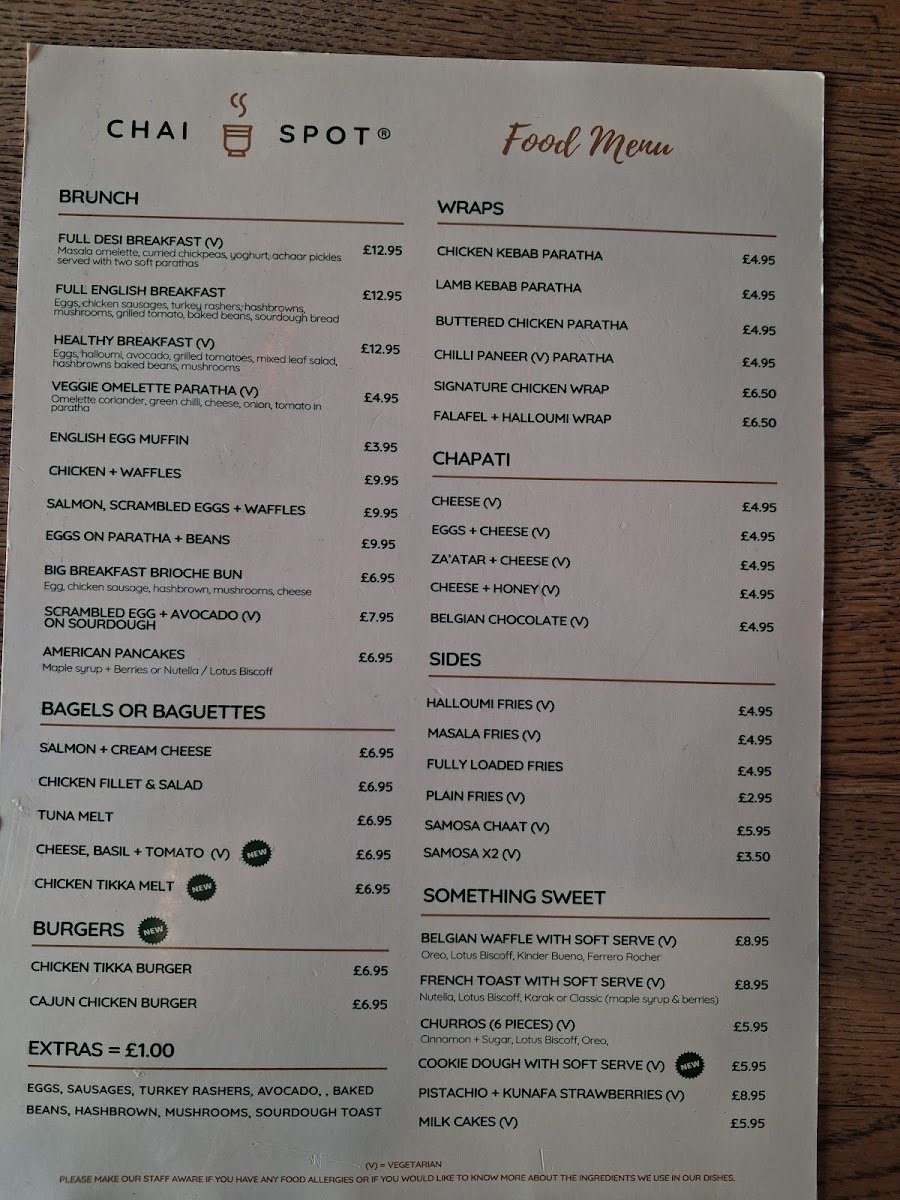 From a reviewer’s perspective, the menu at Chai Spot offers an impressively diverse selection that blends Desi and Western comfort food, with highlights across brunch, wraps, and sweet treats. The brunch section stands out with options like Full Desi Breakfast, Full English Breakfast, and Healthy Breakfast Veggie Omelette Paratha, while the wraps section features flavorful choices such as Chicken Kebab Paratha, Lamb Kebab Paratha, Buttered Chicken Paratha, and Signature Chicken Wrap. The chapati options, including Za’atar + Cheese and Belgian Chocolate, add a creative twist, and sides like Halloumi Fries, Masala Fries, and Samosa Chaat make great additions to any meal. For something sweet, desserts like Belgian Waffle With Soft Serve, French Toast With Soft Serve, Churros, and Cookie Dough With Soft Serve are particularly tempting. The drinks menu is equally extensive, featuring traditional options like Karak Chai and Pink Kashmiri Chai, alongside specialty drinks such as Spanish Latte, Pistachio Latte, Multan Mango Mojito, and Mango Lassi milkshake. Overall, the menu is varied and appealing, offering everything from hearty breakfasts and savory parathas to indulgent desserts and creative drinks, making it a well-rounded spot for both meals and casual café visits.