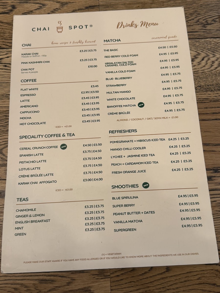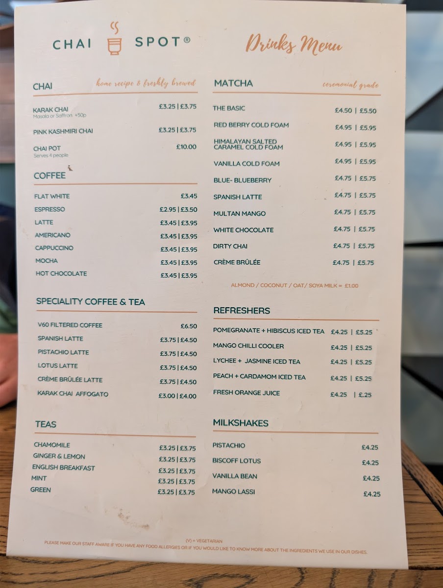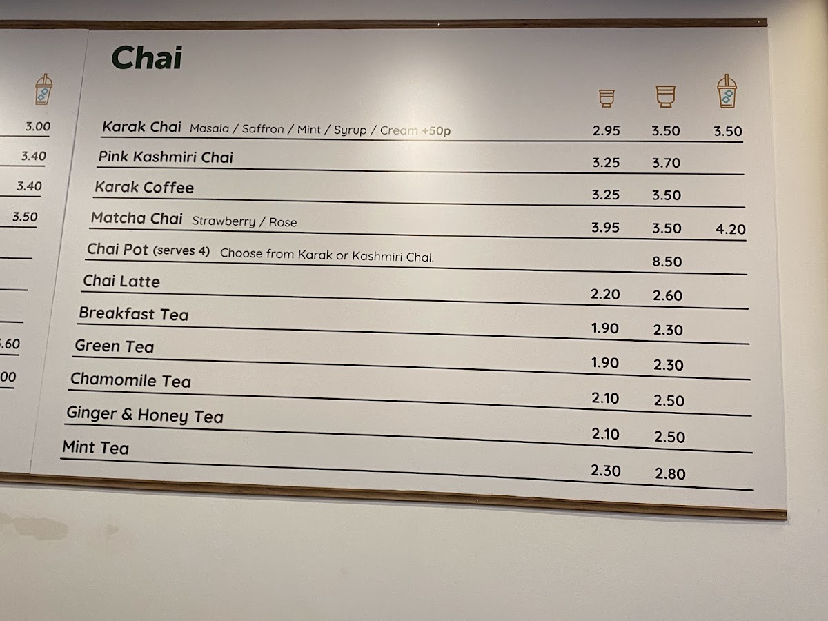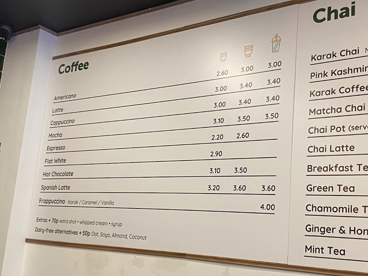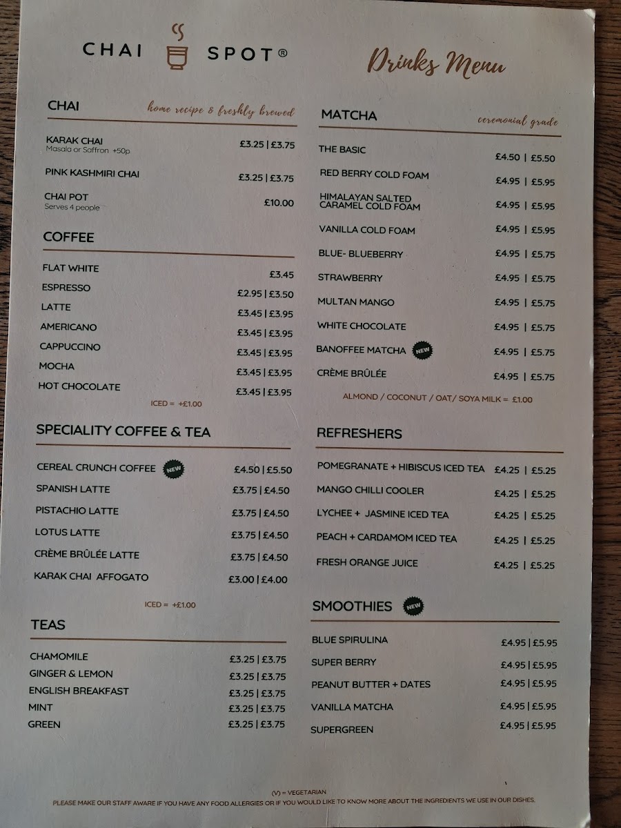 From a reviewer’s perspective, the menu at Chai Spot offers an impressively diverse selection that blends Desi and Western comfort food, with highlights across brunch, wraps, and sweet treats. The brunch section stands out with options like Full Desi Breakfast, Full English Breakfast, and Healthy Breakfast Veggie Omelette Paratha, while the wraps section features flavorful choices such as Chicken Kebab Paratha, Lamb Kebab Paratha, Buttered Chicken Paratha, and Signature Chicken Wrap. The chapati options, including Za’atar + Cheese and Belgian Chocolate, add a creative twist, and sides like Halloumi Fries, Masala Fries, and Samosa Chaat make great additions to any meal. For something sweet, desserts like Belgian Waffle With Soft Serve, French Toast With Soft Serve, Churros, and Cookie Dough With Soft Serve are particularly tempting. The drinks menu is equally extensive, featuring traditional options like Karak Chai and Pink Kashmiri Chai, alongside specialty drinks such as Spanish Latte, Pistachio Latte, Multan Mango Mojito, and Mango Lassi milkshake. Overall, the menu is varied and appealing, offering everything from hearty breakfasts and savory parathas to indulgent desserts and creative drinks, making it a well-rounded spot for both meals and casual café visits.